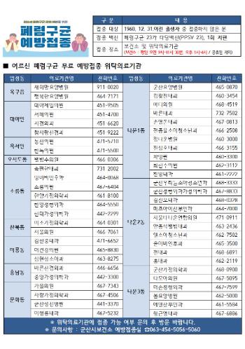 아직 접종하지 않은 1960년생(주민등록상 1960년 12월 31일 이전 출생)시민은 주소지와 관계없이 신분증을 지참하여 군산시 보건소 또는 가까운 지정 의료기관을 방문하면 23가 다당 백신(PPSV23)을 1회 무료로 접종받을 수 있다.