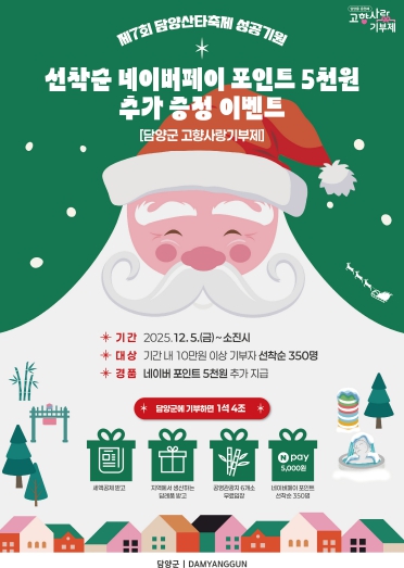 이번 이벤트는 10만 원 이상 고향사랑기부금을 낸 사람 중 선착순 350명에게 네이버페이 포인트 5천 원권을 추가 증정하는 행사로, 당첨자는 이벤트 종료 후 개별 안내할 예정이다.