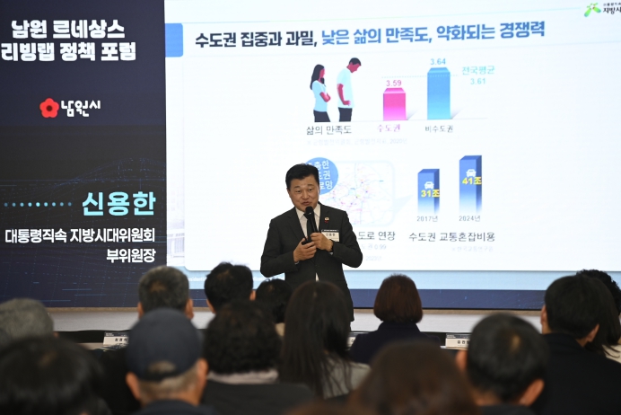 1부는 ‘5극 3특 시대 남원형 생활인구 확대, 어떻게 준비할 것인가’라는 주제 아래 신용한 지방시대위원회 부위원장이 ▲‘지역이 살아야 대한민국이 산다’를 주제로 5극 3특 권역별 메가시티 기반 국가균형성장 전략과 ▲초광역 발전전략을 통한 청년 정주 기반 강화 필요성을 강조하며 기조연설을 진행했다.