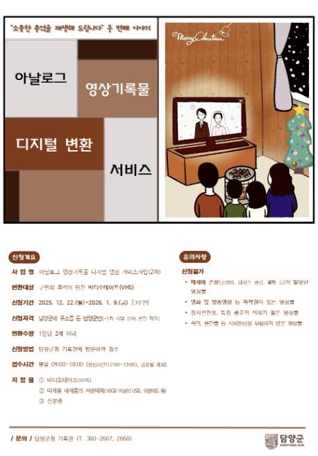 디지털 변환 대상은 비디오테이프(VHS)로, 1인당 최대 2개까지 신청할 수 있다. 신청자는 변환할 비디오테이프와 외장하드, 이동식 저장장치(USB) 등 저장매체, 신분증을 지참해 담양군청 기록관(미래성장동 2층)을 방문하면 된다. 변환된 영상물의 기증을 희망할 경우, 기록물 사본 활용에 대한 동의가 필요하다.