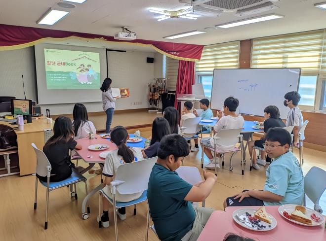 ![]() 군내북초 학생들이 아침간편식을 먹으며 아침독서활동을 하고 있다. |