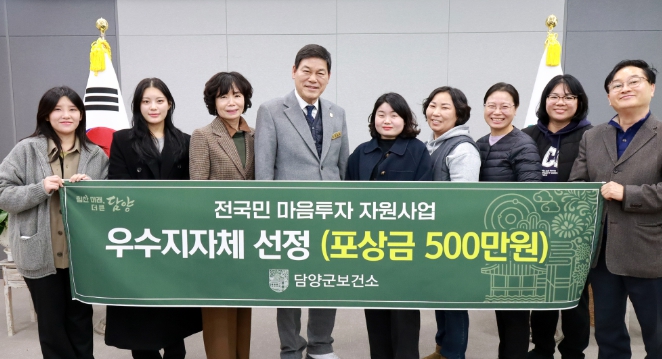 담양군은 군민의 마음 건강을 위한 정책을 꾸준히 추진해 온 성과를 인정받아 보건복지부 주관 ‘전국민 마음투자 지원사업 평가’에서 우수 지자체로 선정, 포상금 500만 원을 수상했다고 밝혔다.