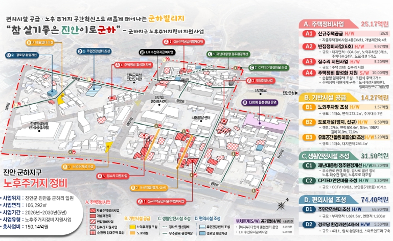 군하지구 노후주거지정비 지원사업은 진안읍 군하리 일원의 노후 저층주거 밀집지역으로“참 살기좋은 진안이로 군하”라는 사업 비전으로 주택정비사업, 기반시설공급, 생활안전시설 조성 등 2026년부터 2030년까지 5년간 추진하게 된다.