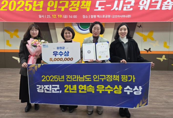 ![]() 강진군이 전남도가 실시한 2025년 인구정책 우수 시·군 평가에서 우수상을 받았다. |