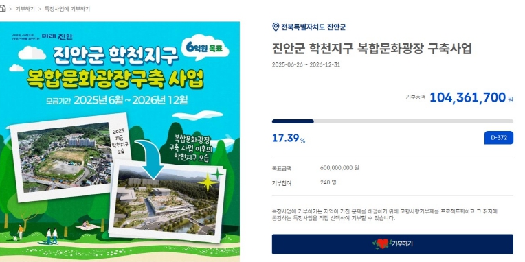 이번 모금사업명은 “학천지구 복합문화광장 구축사업”으로 도심 기능 강화와 녹색도시(Green City)로의 변모를 목표로 추진되는 군의 대표적인 도심재생사업으로 현재 읍소재지 중심지인 학천지구 1·2·3블럭의 지혜의숲 도서관, 문화예술회관, 온가족다올마루, 공영주차장과 상부의 문화광장 등 자연과 문화, 휴식이 어우러진 복합문화공간을 조성 중에 있다.