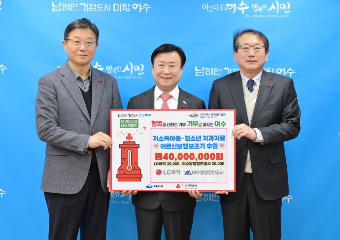 ![]() 지난 23일 LG화학 여수공장과 여수광양항만공사가 저소득 아동·청소년 치과치료 지원사업과 노인 보행 보조기 지원사업 추진을 위해 2천만 원씩 총 4천만 원을 후원하는 증서를 여수시에 전달했다. |