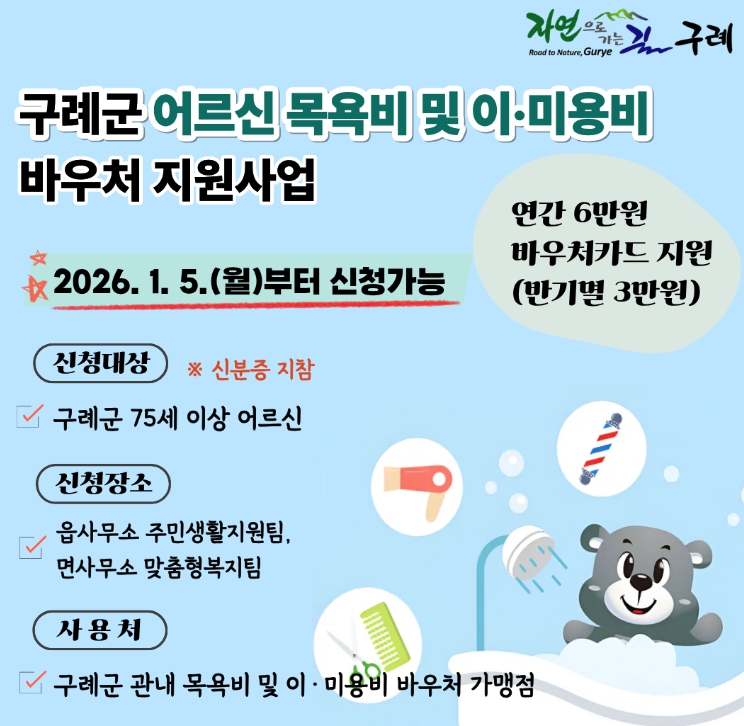 ![]() 75세 이상 어르신에 ‘목욕비 및 이·미용비 바우처’지원 |