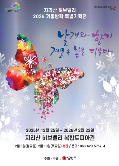 남원시 관계자는 “추운 겨울, 지리산 자락에서 봄의 기운을 먼저 느낄 수 있도록 나비와 꽃, 향기를 주제로 이번 전시를 기획했다” 며, “가족, 연인들이 방문해 나비의 날갯짓처럼 희망찬 새해를 설계하는 소중한 시간이 되길 바란다”고 전했다.