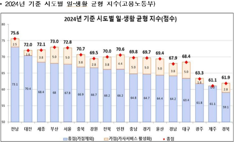 2024년 일·생활 균형지수 평가 결과, 전국 17개 시·도 평균은 65.7점이며 전남은 이보다 7.4점 높았은 점수를 기록했다.
