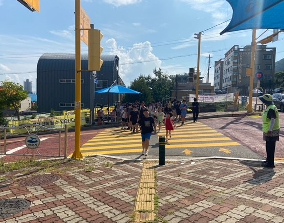 ![]() 등하굣길 안전지킴이의 교통안내 지도에 따라 학생들이 안전하게 하교하고 있다. |