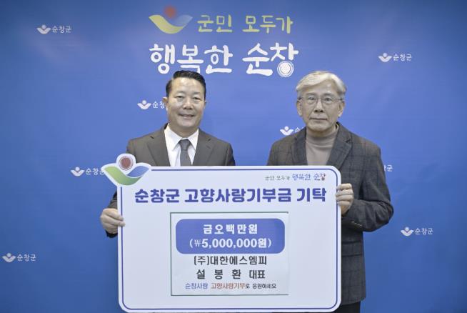 ![]() (주)대한에스엠피 설봉환 대표, 순창군에 고향사랑기부금 500만원 기탁 |