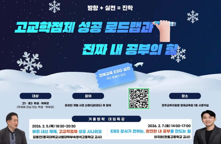 채선영 교육장은 “학년 전환기와 대입 제도 전환기가 맞물린 지금은 학생과 학부모 모두에게 진학에 대한 고민이 집중되는 시기”라며 “이번 겨울방학 프로그램이 변화하는 교육 환경 속에서 진학 준비의 방향을 차분히 정리하고, 새 학년을 준비하는 데 실질적인 도움이 되기를 바란다”고 말했다.