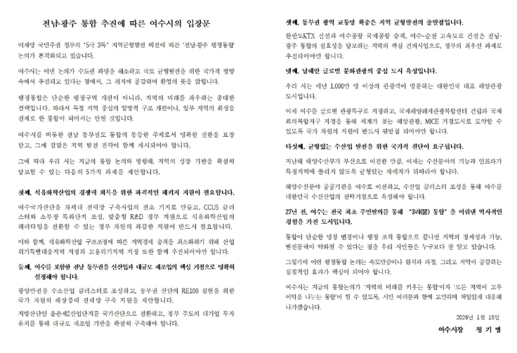 정기명 여수시장은 “여수는 과거 전국 최초로 주민발의를 통한 ‘3려 통합’을 이뤄낸 자치 분권의 상징적 도시”라며 “이번 행정통합이 여수의 정체성을 지키면서도 새로운 도약의 기회가 될 수 있도록 시민들과 함께 치밀하게 대응해 나가겠다”라고 밝혔다.