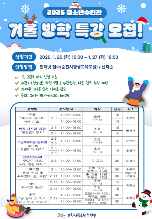 ![]() 순천시 청소년수련관 겨울방학 특강 운영 |