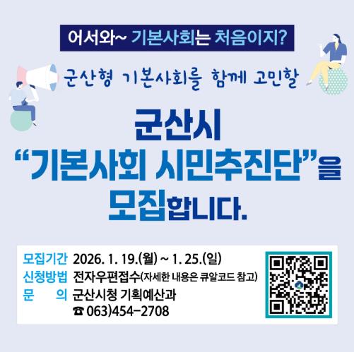 ![]() 군산시, ‘시민주도 기본사회’ 를 이끌 시민추진단 모집 |