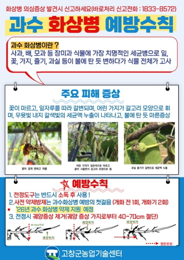 또한 농가에서는 과수의 꽃, 잎, 가지 등에 이상 증상이 나타날 경우 자체 판단으로 제거하지 말고 즉시 고창군 농업기술센터에 신고해 정밀 진단을 받아야 한다. 조기 신고는 확산 방지와 피해 최소화에 결정적인 역할을 한다.