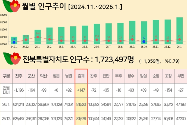 행정안전부 주민등록 인구통계에 따르면 2026년 1월 말 기준 김제시의 주민등록인구는 81,823명으로 전월 대비 147명이 증가했다.