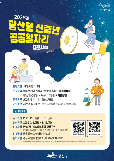 광산구 관계자는 “이번 사업이 조기 퇴직, 경력 단절 등으로 어려움을 겪는 신중년에게 다시 사회로 나아가기 위한 디딤돌이 되길 바란다”라며 “광산구에서 추진하는 공공일자리 사업이 신속하게 추진 될 수 있도록 역량을 집중하겠다”라고 전했다.
