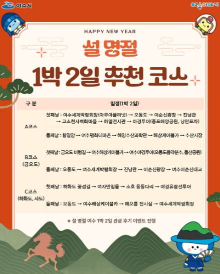 ![]() 여수시가 설 명절 연휴를 맞아 가족 단위 관광객과 귀성객을 대상으로 대표 관광지를 연계한 체류형 1박 2일 코스를 홍보하고 이벤트를 진행한다. |