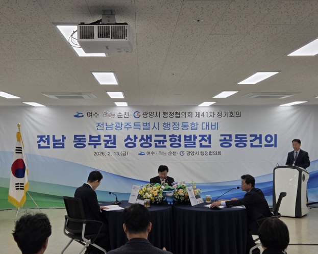 13일 여수시에 따르면, 협의회는 이날 국립순천대학교 우석홀에서 제41차 정기회의를 개최하고 행정통합이라는 거대한 변화의 흐름에서 전남 동부권의 밝은 미래를 담보하기 위한 공동건의 3건(여수시 발의 2건)을 공식 의결했다.