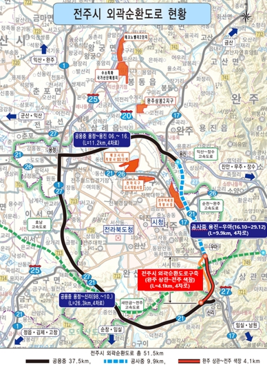 현재까지 완주 신리~전주 용정~용진을 잇는 37.5km 구간은 사업비 7,149억원을 들여 개통 운영 중이며, 전주 용진~우아(색장동) 9.9km 구간은 사업비 3964억 원을 들여 2029년 준공을 목표로 공사가 진행 중이다. 하지만 완주 상관~전주 색장 구간은 아직 착수 단계에 이르지 못해 외곽순환망의 기능이 반쪽에 그치고 있다는 지적이 이어져 왔다.