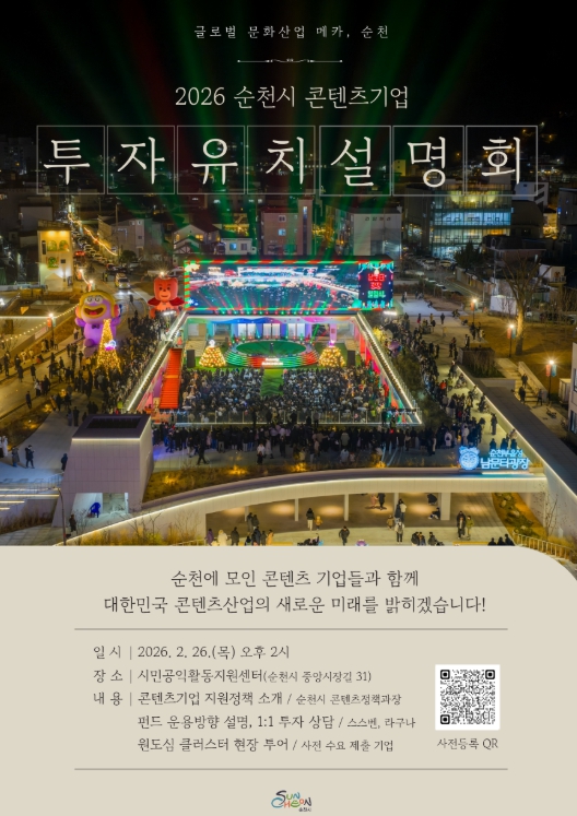 ![]() 순천시, 2026 콘텐츠기업 투자유치 설명회 |