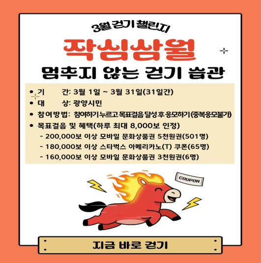 ![]() 광양시, 워크온 ‘작심삼월, 멈추지 않는 걷기 습관! 3월 걷기 챌린지’ 운영 |