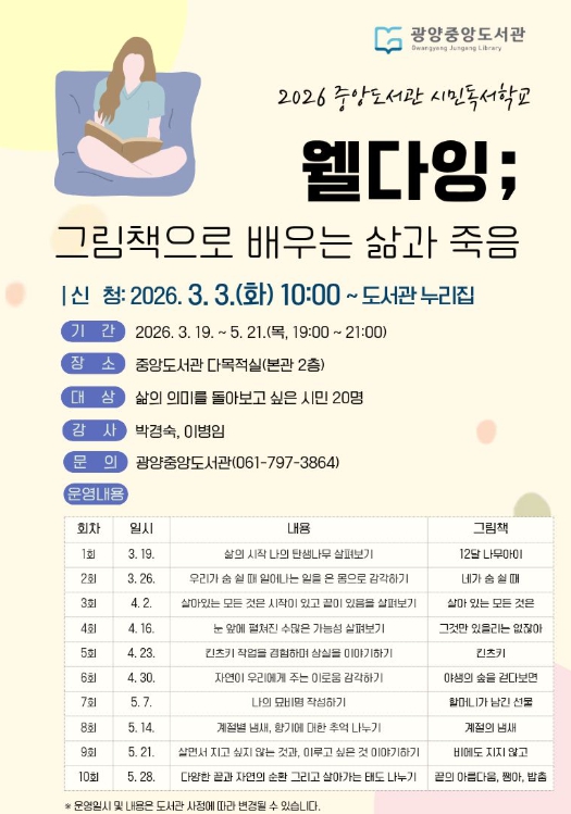 ‘인문학강독- 화요철학회’는 3월 17일부터 5월 19일까지 매주 화요일 오전 9시 30분, ‘웰다잉; 그림책으로 배우는 삶과 죽음’은 3월 19일부터 5월 21일까지 매주 목요일 오후 7시에 광양중앙도서관 다목적실에서 운영된다.