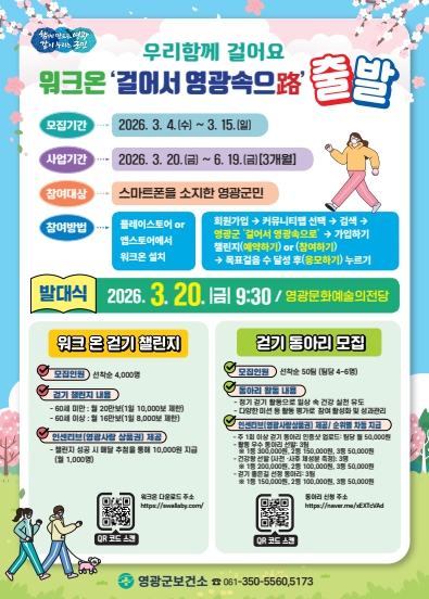 워크온'걸어서 영광속으로'참여 및 걷기 동아리 신청에 관한 자세한 사항은 영광군보건소 건강정책팀로 문의하면 된다.