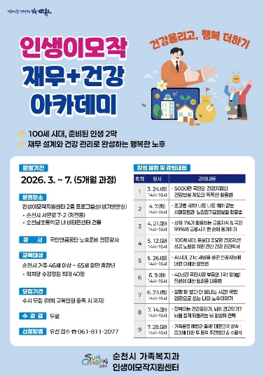 ![]() 순천시 인생이모작지원센터, 재무 ‧ 건강 아카데미 수강생 모집 |