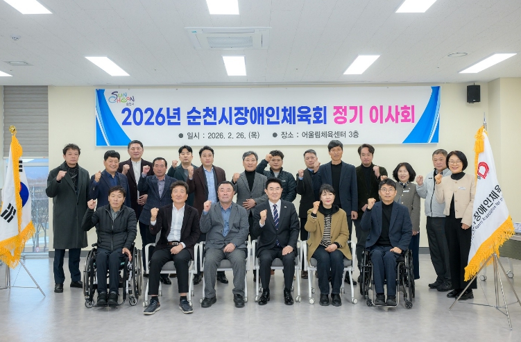 ![]() 지난 26일 순천 어울림체육센터에서 열린 2026년 순천시장애인체육회 정기이사회에서 단체 기념촬영을 하고 있다. |