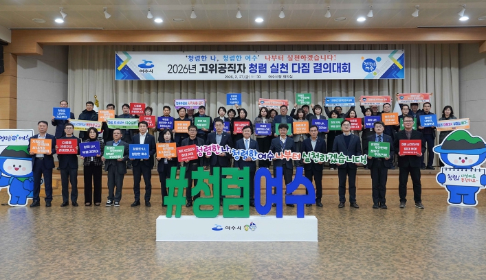 ![]() 여수시는 지난 2월 27일 정기명 시장을 비롯한 간부 공무원 50여 명이 참여해 시청 회의실에서 ‘청렴 실천 다짐 결의대회’를 개최했다. |