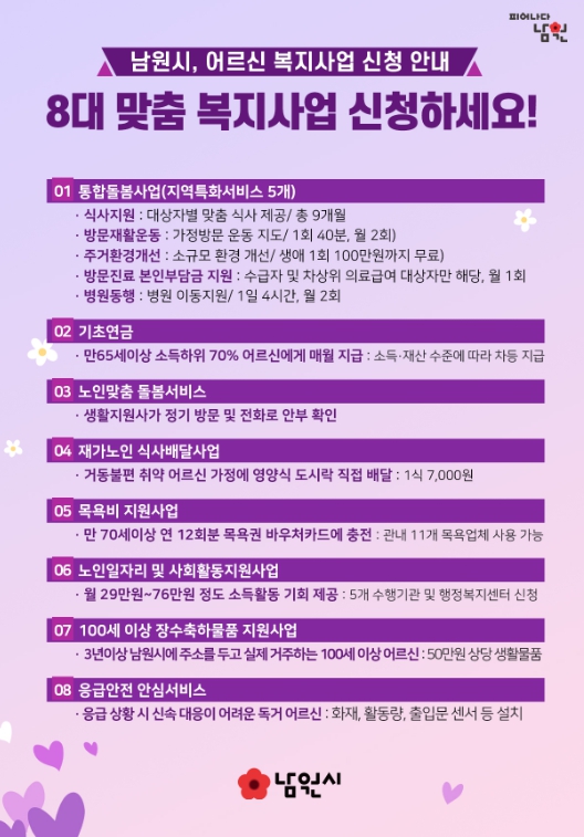 이러한 가운데 남원시는 어르신 생활 전반을 아우르는 8대 맞춤형 복지서비스를 중심으로 촘촘한 노후 안전망 구축에 나서고 있다.