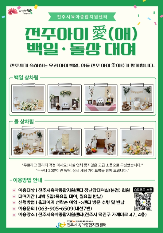 ![]() ‘전주 아이愛(애) 백일·돌상 무료대여 사업’ 시행 |