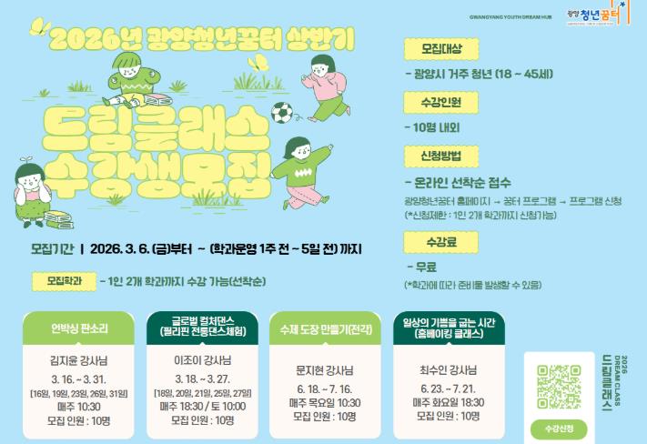 ![]() 광양청년꿈터, ‘2026년 상반기 드림클래스’ 수강생 선착순 모집 |
