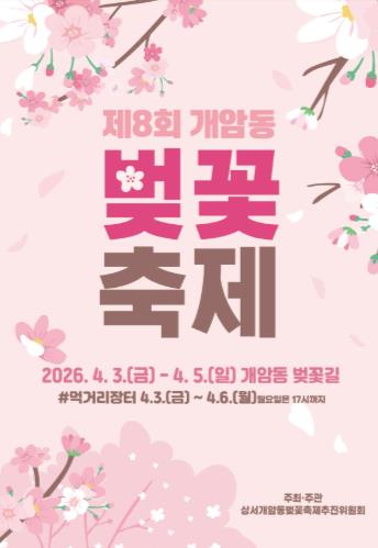 최기현 추진위원장은 “풍성한 축제가 되기 위해 벚꽃 문화공연 프로그램, 푸드존, 문화체험 프로그램 등 차질 없이 준비하고 있으니 올봄 개암동 벚꽃길을 가족, 연인, 친구와 함께 꽃길 걸으며 행복하고 사랑스러운 시간을 맞이하기 바란다”고 말했다.