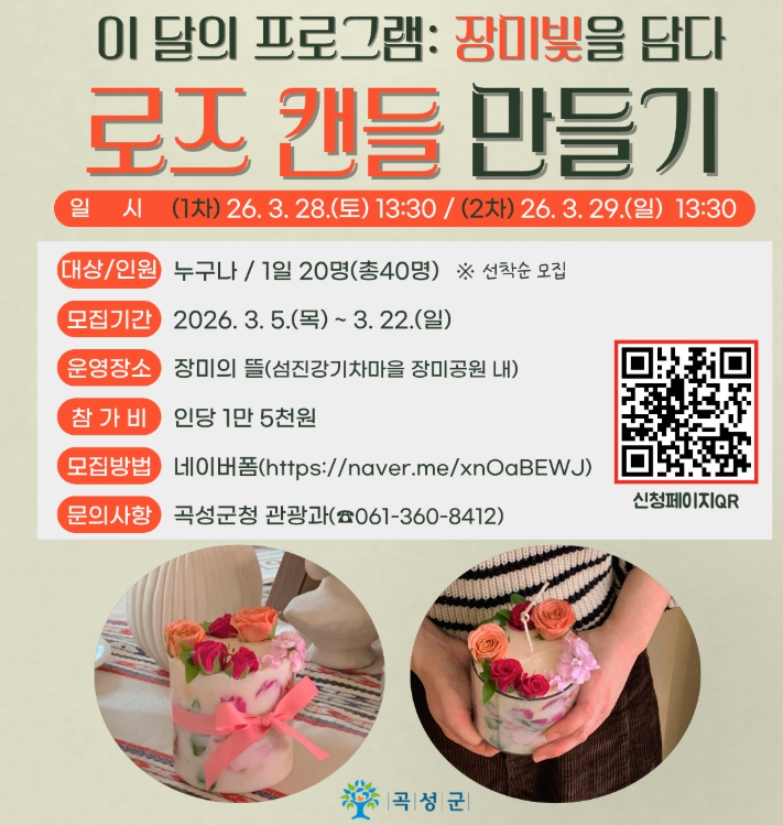 이번 프로그램은 곡성 섬진강기차마을 장미공원 내 ‘장미의 뜰’에서 진행되는 체험형 관광 행사로, 봄을 맞아 장미의 향기와 감성을 직접 담아볼 수 있도록 마련됐다.