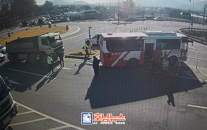 전남소방본부에 따르면 3월 19일 오전 8시 58분경, 담양군 담양읍 강쟁리 담양공고 회전교차로에서 덤프트럭과 고속버스가 추돌하는 사고가 발생했다.