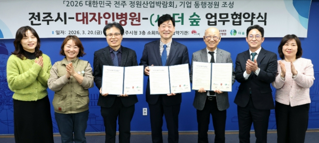 전주시와 대자인병원(이사장 이병관), 사단법인 더숲(대표 정명운)은 20일 시청 3층 소회의실에서 ‘2026 대한민국 전주정원산업박람회’ 기업동행정원 조성을 위한 업무협약을 체결했다.