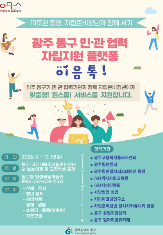 동구 관계자는 “이음톡!은 자립준비청년 한 명 한 명이 지역사회와 촘촘히 연결되어 성장할 수 있도록 돕는 따뜻한 울타리”라며 “청년들이 건강한 사회구성원으로 자리 잡을 수 있도록 지속적으로 지원을 이어가겠다”고 말했다.