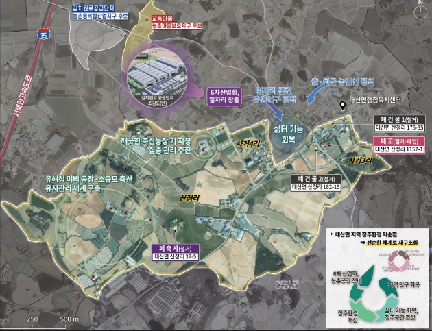 주요 사업 내용으로는 ▲폐축사 14동 ▲대성고등학교(2004년도 폐교) 13동 ▲폐건물 8동 등 총 4개소 35개동의 폐건축물 정비하게 된다. 타 사업 단계별 연계 투자를 통해 주민들을 위한 생활 서비스 공급 시설이나 정주 기능의 공간으로 재탄생할 전망이다.