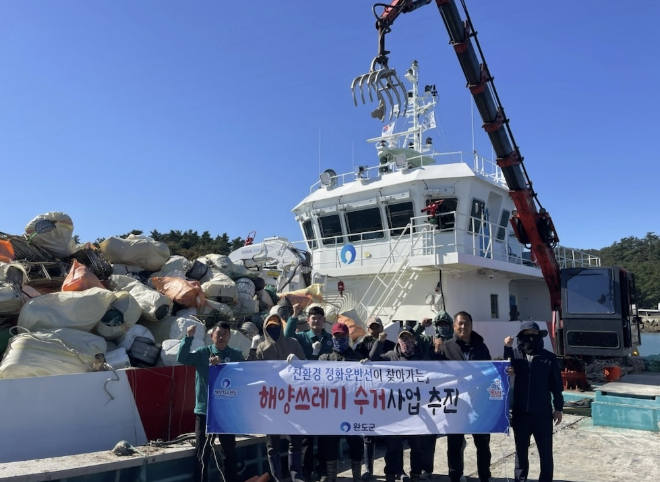 ![]() 완도군에서 친환경 정화 운반선을 동원해 해양 쓰레기를 수거하는 모습 |