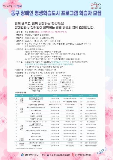 동구 관계자는 “이번 특성화 사업을 통해 장애인의 학습권을 실질적으로 보장하고, 인문과 디지털이 융합된 ‘동구형 평생학습 모델’을 확산해 나가겠다”며 “앞으로도 누구나 차별 없이 배우고 성장할 수 있는 장애친화 평생학습도시를 만들어 가기 위해 최선을 다하겠다”고 말했다.