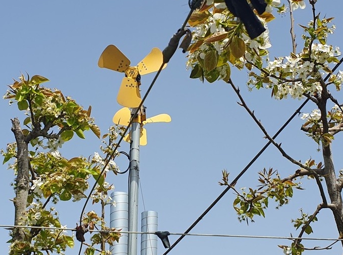 ![]() 저온서리피해를 예방하기 위해 설치된 방상팬. |