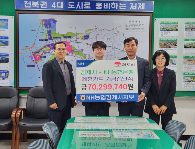 전달식에는 이현서 김제 부시장을 비롯해 강대연 NH농협은행 김제시지부 지부장, 소순지 김제시금고 지점장, 김재훈 회계과장이 참석한 가운데 2025년도 제휴카드 적립기금 7천29만원을 전달했다.