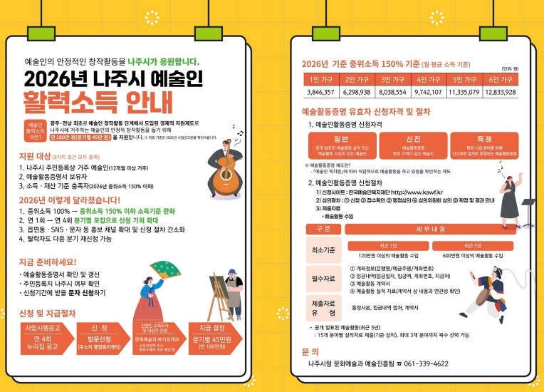 15일 나주시에 따르면 지역 예술인의 안정적인 창작 활동을 돕기 위해 ‘2026년 2분기 예술인 활력소득 지원금’ 신청을 받고 있다.