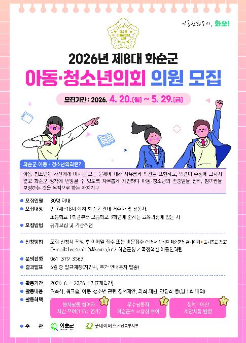 ![]() 2026년 제8대 화순군 아동·청소년의회 의원 모집 홍보 포스터 |