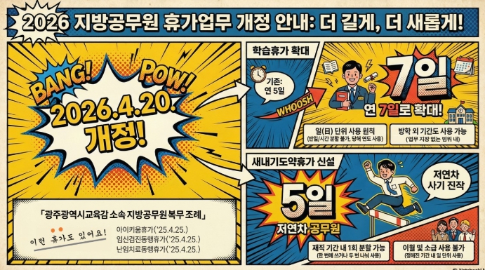 시교육청은 20일 ‘광주광역시교육감 소속 지방공무원 복무 조례’ 일부개정에 맞춰 ‘광주광역시교육감 소속 지방공무원 휴가업무 운영요령’을 개정·시행했다.