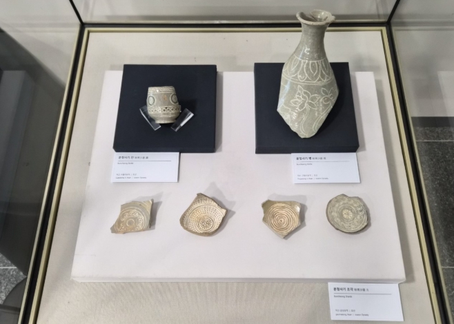 분청사기 잔과 병 등에 새겨진 다양한 문양과 조형미를 한눈에 살펴볼 수 있다.