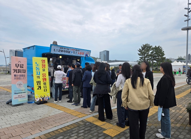 현장에는 커피차를 배치해 음료를 제공하고, 노동존중 메시지를 담은 현수막 설치와 홍보물 배부 등 참여형 방식으로 운영되며 노동의 가치와 존엄성에 대한 인식 제고에 나섰다.